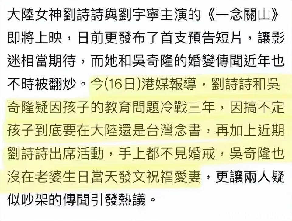 2023年台媒出手,暗指吴奇隆刘诗诗冷战了三年,最大矛盾源头是孩子的教育,而从此以后,双方再也没有正面回应。